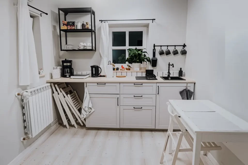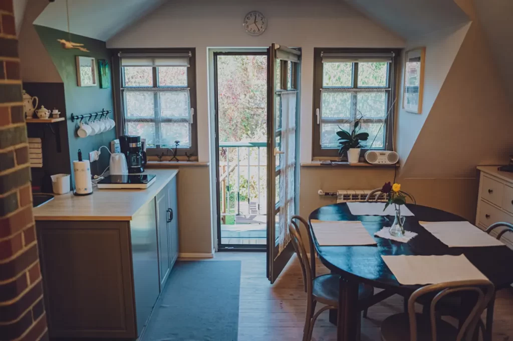 Salonik jest funkcjonalnie zaaranżowany, dzięki temu nasi goście mają dobre warunki do wypoczynku i biesiadowania w gronie przyjaciół, rodziny lub nowych znajomych. Balkon skierowany na zachód sprawia, że pokój do późnych godzin popołudniowych zalany jest słońcem… Siedząc na balkonowym foteliku, pomiędzy drzewami można spostrzec sunących drogą rowerzystów – to Wojewódzka Droga Rowerowa nr 1 zwana książęcą (odległość od domu: 150 m).
