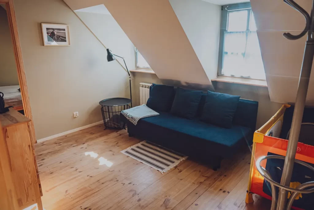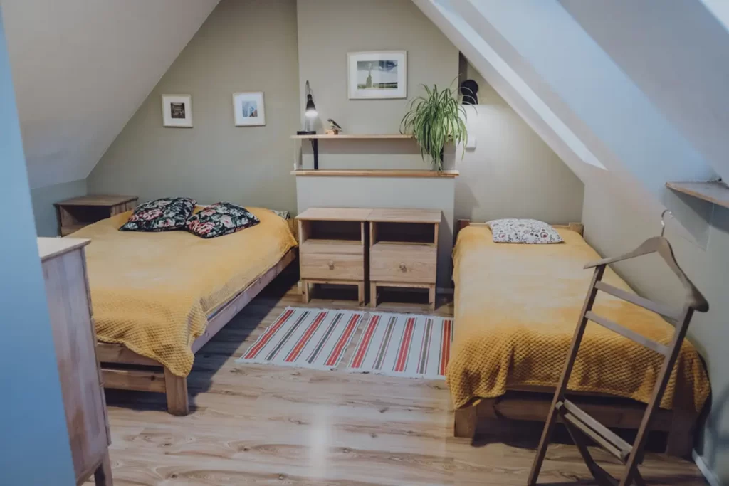 Wspólny pokój apartamentu wyposażony jest w wygodną kanapę, lampę stojącą, komodę, stolik, półkę. Z tego pokoju wchodzimy do łazienki, Pokoju Północnego i Pokoju Południowego. Meble w sypialniach są utrzymane w jednakowej stylistyce, proste i funkcjonalne. Pokój Południowy polecamy dla gości ceniących sobie słoneczne pomieszczenia, a Pokój Północny dla śpiochów zmęczonych pracą lub podróżą. Apartament gwarantuje wygodne zakwaterowanie dla 6 osób.